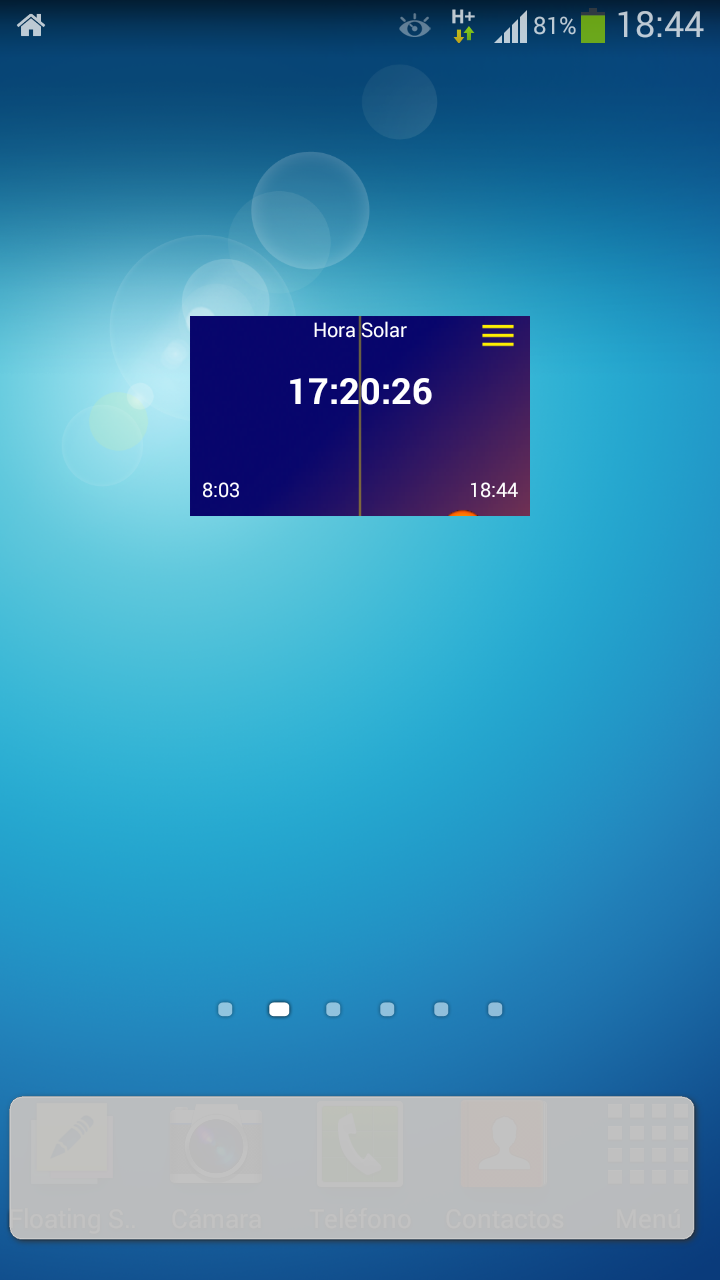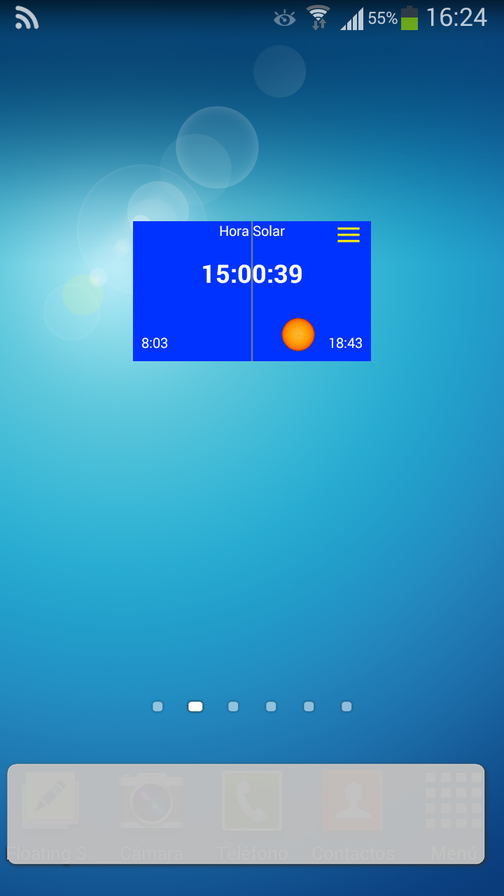 Pulsando en cualquier parte del widget, se actualiza la hora solar. Pulsando en la esquina superior derecha se accede al menú. El simbolo de la esquina superior izquierda indica si la posición se actualiza periodicamente. Pulsando en él, se actualizan las coordenadas del widget. |