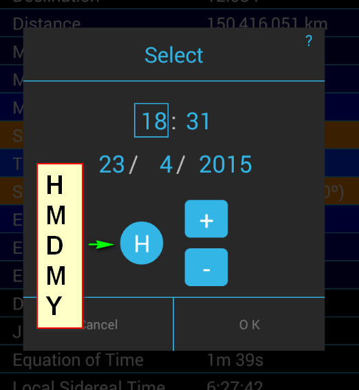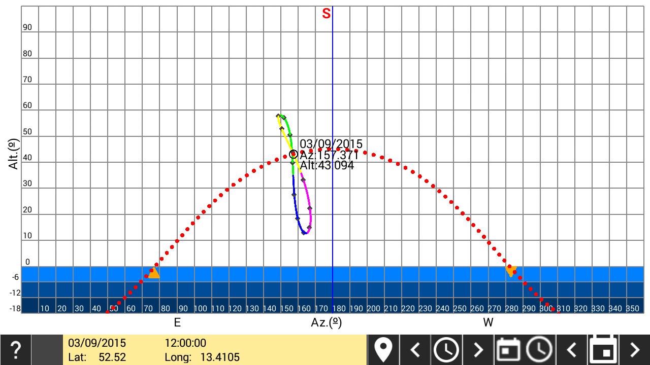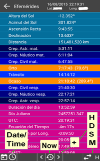 En esta pantalla se muestran las efemérides precisas del Sol en ese instante. En el panel inferior, pulsando en el botón central se actualizan las efemérides y pulsando en los que se encuentran a su lado se calculan incrementando el tiempo en una hora, un día, una semana o un mes dependiendo de lo seleccionado en el botón de la derecha. La selección de este botón irá alternandose en las sucesivas pulsaciones. |