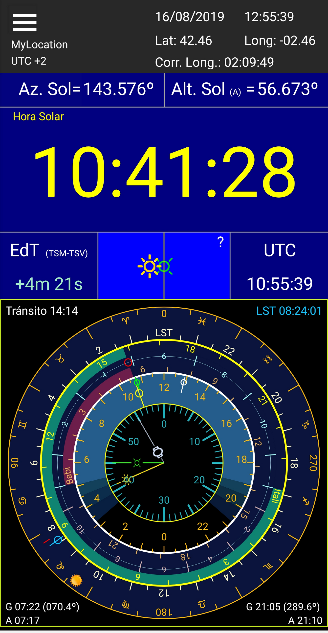 La aplicación Solar Info proporciona información sobre el movimiento diurno y la posición del sol a lo largo del año, que facilita la comprensión de fenómenos que, a pesar de sernos familiares, a veces no entendemos del todo. Resulta una útil herramienta para la instalación y ajuste de relojes de sol al proporcionar la hora solar calculada con precisión con algoritmos astronómicos. Por otra parte proporciona información sobre el movimiento diurno y la posición del sol a lo largo del año, que facilita la comprensión de fenómenos que, a pesar de sernos familiares, a veces no entendemos del todo. La hora solar se actualiza automáticamente y de forma manual al pulsar sobre cualquier parte del widget. Al pulsar sobre el icono situado en el borde superior derecho se accede al menú de la aplicación.