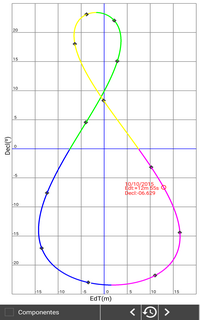 Se muestra un gráfico del analema anual pudiendo ver los valores de la declinación y la Ecuación del Tiempo día a día. |